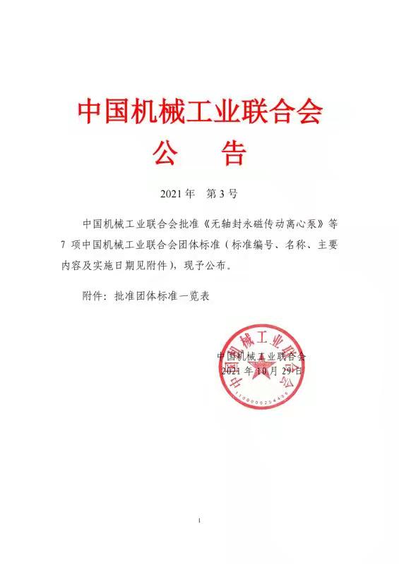 由甘肅省科學(xué)院磁性器件研究所牽頭編制的《無(wú)軸封永磁傳動(dòng)離心泵》標(biāo)準(zhǔn)T/CMIF 149-2021 公布實(shí)施